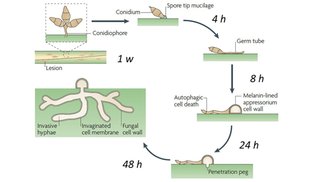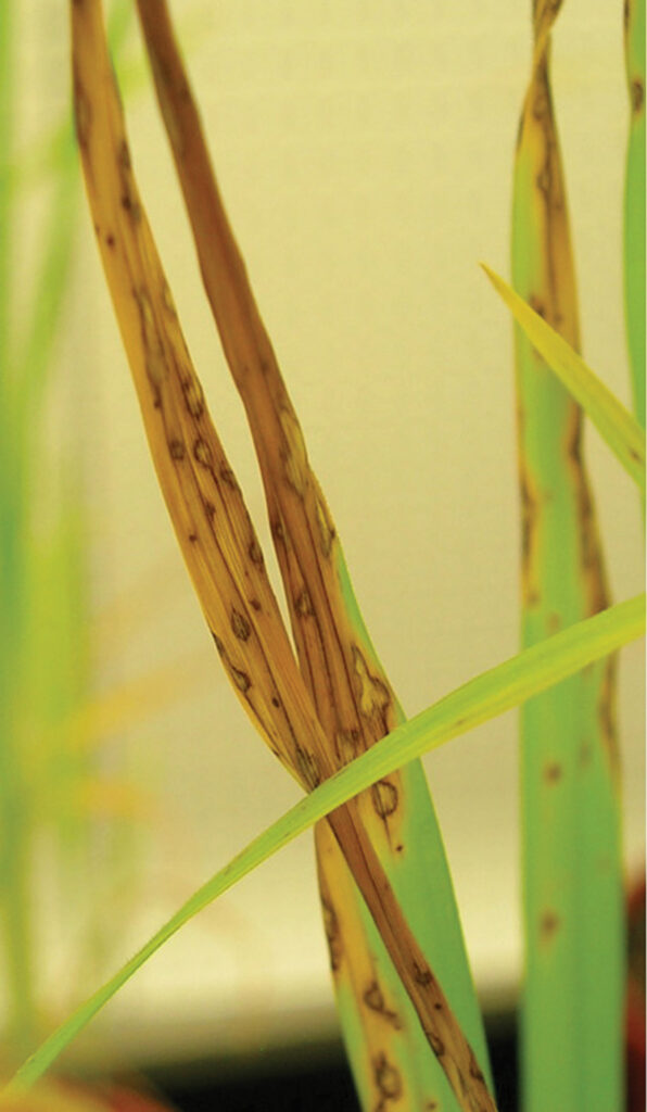 Within about a week, the spores of the Magnaporthe fungus grow on and invade rice leaves, establish themselves inside and produce more spores to spread the infection across the rice field.