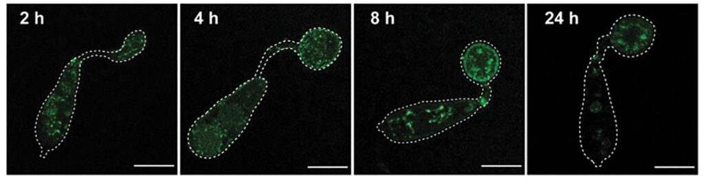 Microscope images of Magnaporthe as it produces an appressorium — a pressurized adhesion structure — filled with the enzyme MoPMO9A, labeled with green fluorescent protein. When the enzyme is secreted by the fungus, it binds both to the fungus and the plant and catalyzes a reaction that breaches the leaf wall.