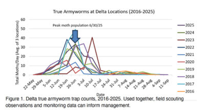 Armyworm Monitoring: In 2025, we monitored true armyworms on three Delta farms, and moth catches peaked around June 30th. Figure 1 shows the average catches across the three farms (9 traps total). The peak population number and timing were similar to what we observed in 2024, which was less severe than in years like 2017, 2018, 2022, and 2023. Trap catches varied across the three farms and across fields on the same farm, which is why it is important to scout for field- level impacts.