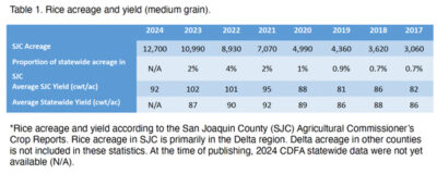 Variety Trial: Delta rice acreage has been steadily increasing, and yields are comparable with the statewide average (Table 1). I estimate that Delta acreage approached, if not exceeded, 15,000 acres in 2025. To support the growing industry, UCCE collaborates with the California Rice Experiment Station to evaluate commercial varieties and advanced breeding lines. The San Joaquin County Delta was one of eight locations in the 2025 statewide trial. The Delta is the only drill- seeded site and is a test site for very-early maturing varieties because it has cooler growing conditions than other rice growing regions of the state. Variety trial results will be available in the February 2026 newsletter.