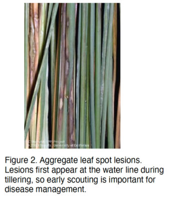 Disease Observations: I did not hear much about diseases this year. I only submitted one sample to the disease diagnostics lab at UC Davis, and they diagnosed aggregate sheath spot (Figure 2). Aggregate sheath spot is similar to stem rot because both diseases can be made worse by low potassium (K) conditions. Potassium can be limiting in some Delta soils, so proper plant nutrition is a good disease management strategy. UC Rice Specialist, Bruce Linquist, wrote this fact sheet about managing K (https://agronomy- rice.ucdavis.edu/sites/g/files/dgvnsk11966/ files/inline-files/328498.pdf). If soil extractable K is less than 60 ppm, K is deficient, and if extractable K is between 60 and 120 ppm, K fertilizer would likely be beneficial. Growers who have observed aggregate sheath spot or stem rot may benefit from testing their soil for K. If K fertility is sufficient and aggregate sheath spot or stem rot are still observed, fungicide treatment is also an option. It is important to scout at late-tillering and early- heading because treatment is most effective when applied between late-boot and early- heading.