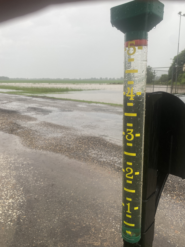 A rain gauge near Lake Chicot in Chicot County, Arkansas, reflects the high volume of rain received Thursday in the area — photo by Clay Gibson