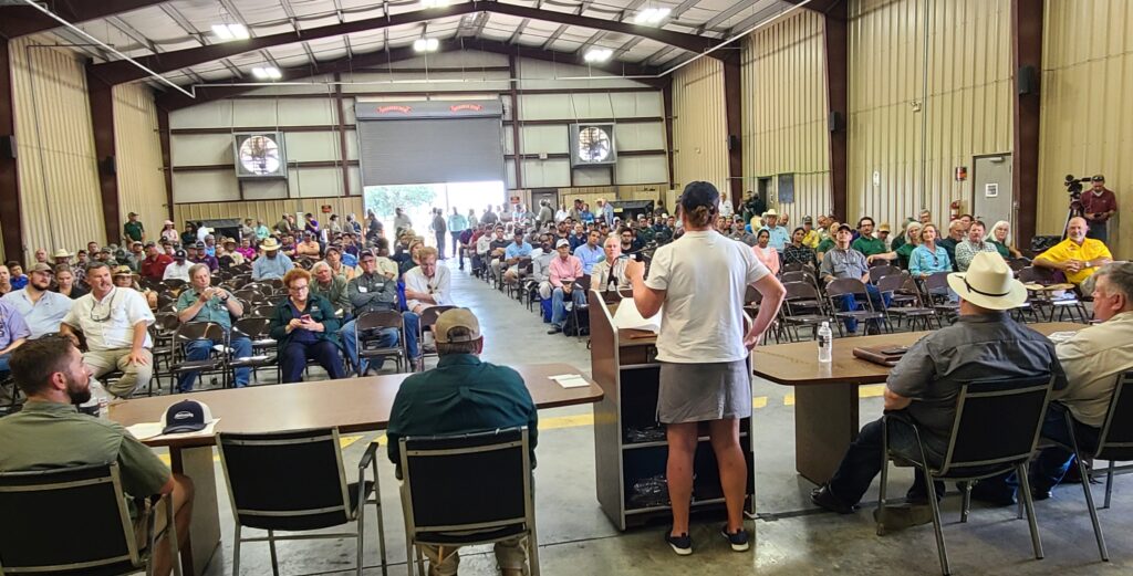 Highlights included Dr. Adam Famoso’s update on the 2023 breeding program that planted more than 10,000 yield plots, 60,000 panicle rows, and more than 800 new breeding crosses. The rice pathology team discussed their work, including investigating reports of Cercospora symptoms that can lead to significant yield loss, while entomologist Dr. Blake Wilson shared information on the rice water weevil, stem boring moths, and the invasive apple snails that continue to plague the area.