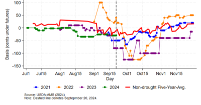 The non-drought five-year-average provides the “normal,” or “expected,” basis. The dashed vertical line denotes the basis most recently reported (-26) on Sept. 10, 2024, which is five cents below the five-year-average basis of -31 cents.