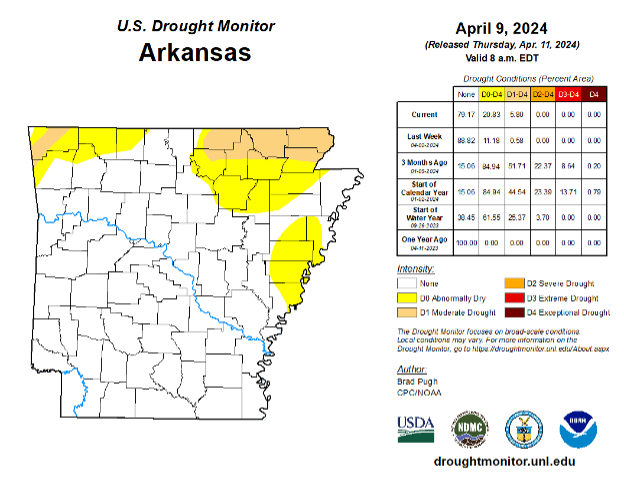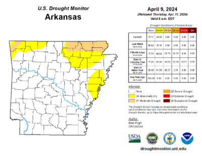 Photo Caption — U.S. Drought Center map from April 11, 2024, showing abnormally dry and moderate drought areas in the northern part of Arkansas. Image courtesy the U.S. Drought Center.