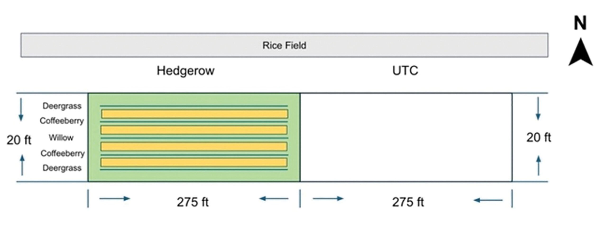 The study site is located on a permanent levee next to a rice field in Arbuckle, in Colusa County. The field is rotated with annual crops, with rice being the main crop. The hedgerow area and the unplanted control area are adjacent and share the same soil type. Both the hedgerow and control areas measure 275 feet in length and 20 feet in width (Fig. 1).