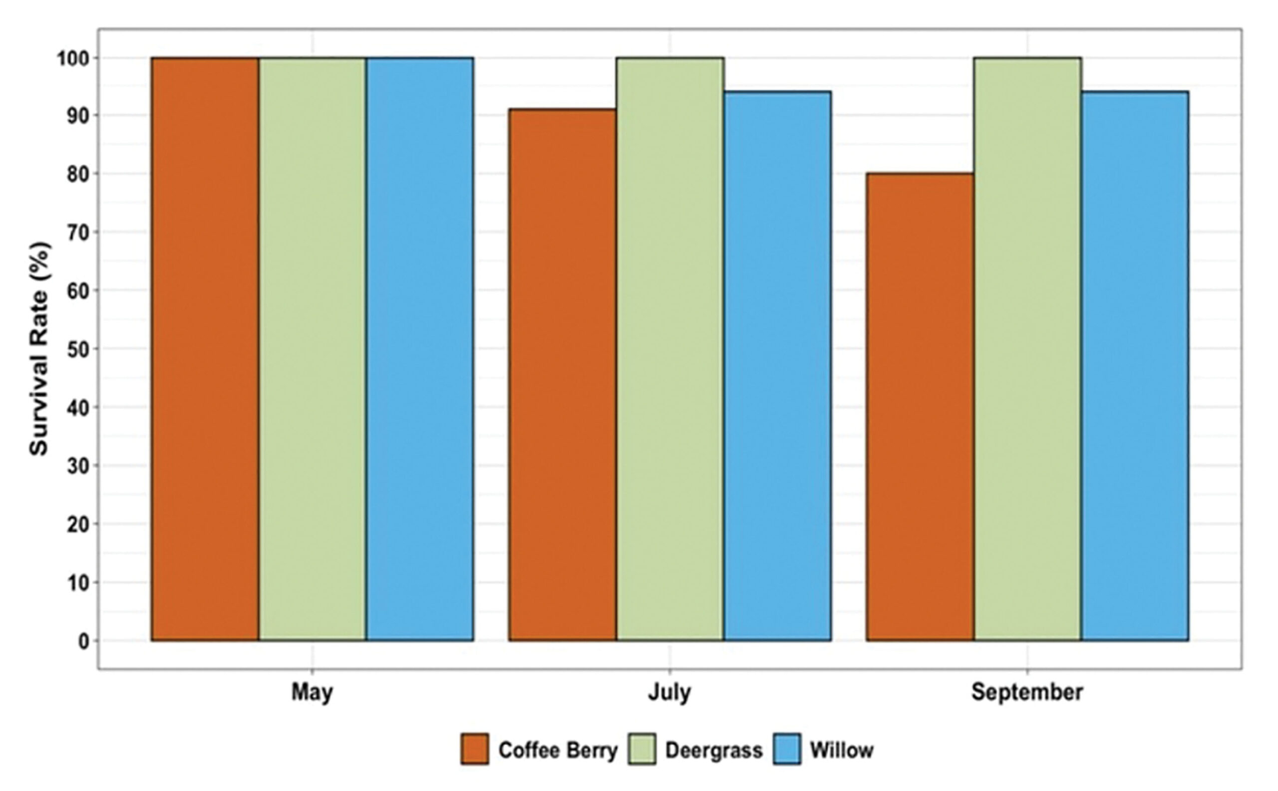 Figure 3: Percent survival of the transplanted coffeeberry, deergrass, and willow at 1 month, 3 months, and 5 months after planting.
