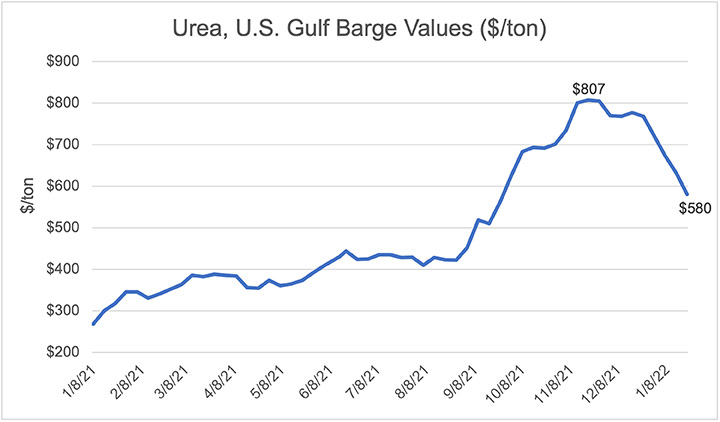 From conversations with Mid-South growers and suppliers, it appears the price decline in urea barge values at the Gulf translated to the retail level. By mid-to-late January, pre-pay urea offers near $675 per ton were reported in some areas — significantly lower than prices plugged into budgets near the end of 2021.