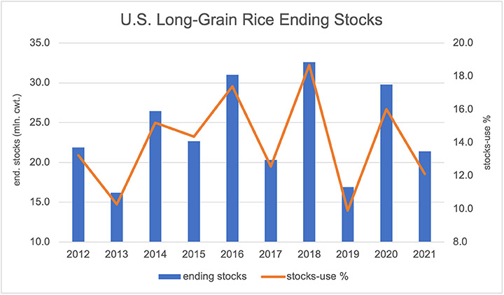 Despite record rice yields in Arkansas, Missouri and Mississippi, U.S. long-grain production was down 15% in 2021 on lower acreage. As a result, ending stocks are expected to drop in 2021/22. Long-grain ending stocks are currently projected at 21.4 million cwt.; down 28% from last year. This equates to a stocks-to-use ratio of 12.1% — below the previous five and 10-year average of 14%.