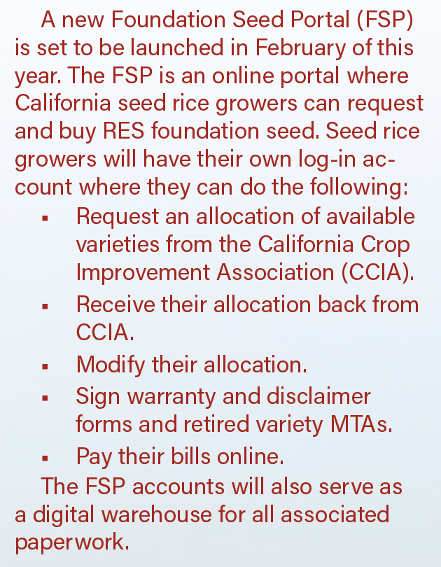 A new Foundation Seed Portal (FSP) is set to be launched in February of this year. The FSP is an online portal where California seed rice growers can request and buy RES foundation seed. Seed rice growers will have their own log-in account where they can do the following: ■ Request an allocation of available varieties from the California Crop Improvement Association (CCIA). ■ Receive their allocation back from CCIA. ■ Modify their allocation. ■ Sign warranty and disclaimer forms and retired variety MTAs. ■ Pay their bills online. The FSP accounts will also serve as a digital warehouse for all associated paperwork.