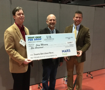 John Allen McGraw of Star City, Arkansas, (with big check) took top honors in the University of Arkansas’ Most Crop per Drop Contest with a yield of 208 bushels per acre and a water-use efficiency of 7.2 bushels per acre-inch of water.