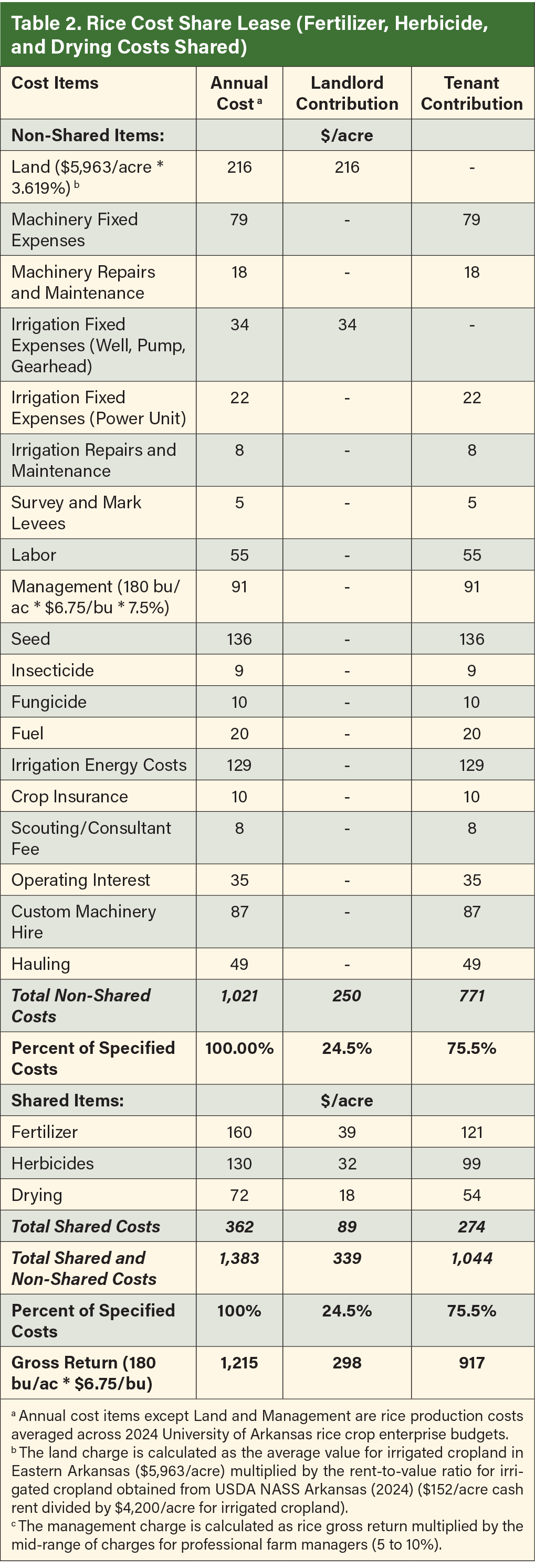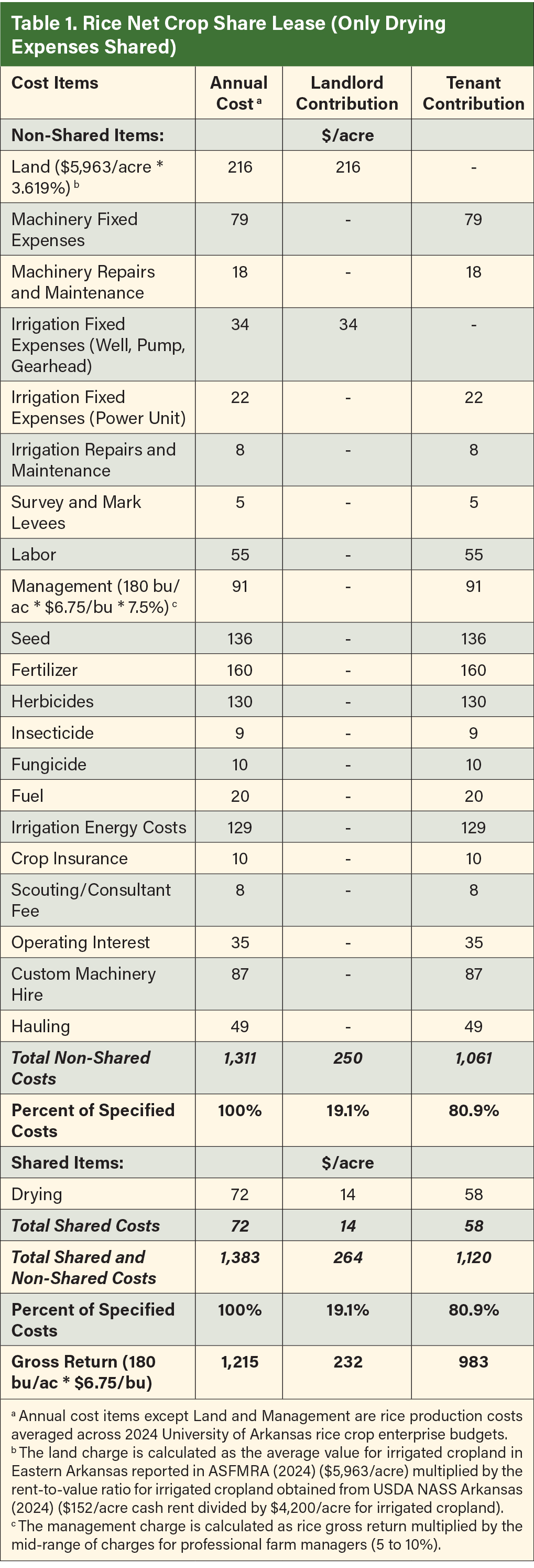 Typically for rice in the Mid-South, the landlord supplies the land and pays all below-ground irrigation expenses (well, pump, gearhead fixed expenses) in exchange for a share of the crop. The tenant pays all above-ground irrigation expenses (irrigation power unit fixed expenses, irrigation energy), supplies all machinery, and pays virtually all variable costs. The rice drying cost is the only variable cost shared between the two parties. Other crop share leases exist where specific costs like fertilizer are shared, but these lease types are less common than the net crop share lease.