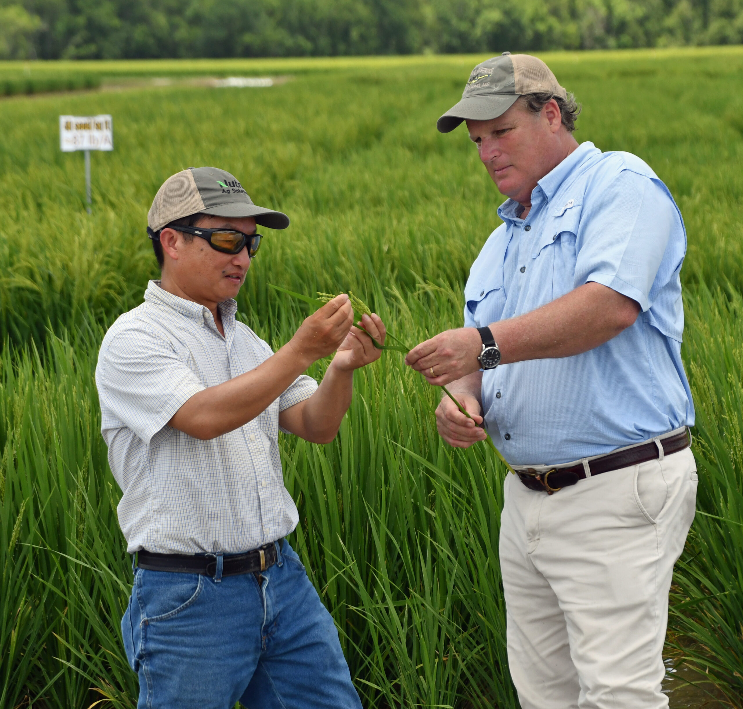 Nutrien’s Randy Ouzts (right) and senior breeder Dr. Qiming “Doc” Shao check out some of their varieties in a trial at the LSU AgCenter’s H. Rouse Caffey Rice Experiment Station near Crowley, Louisiana — photo by Vicky Boyd