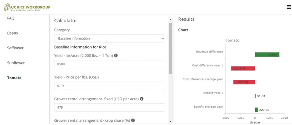 The tool allows farmers to enter variables unique to their operation to calculate potential costs and benefits of rotating from rice to dry beans, tomato, sunflower, or safflower.