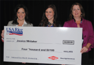 The 2013 National Rice Month Scholarship grand prize was awarded to Jessica Whitaker of McGehee, Ark. From left: Dow AgroSciences’ Leslie Hooker, grand prize winner Jessica Whitaker and USA Rice CEO Betsy Ward. Whitaker took top honors and earned a $4,000 scholarship for her mass media promotion about the benefits of the rice industry. Whitaker’s news articles reached an estimated audience of 21,000 throughout southeast Arkansas.