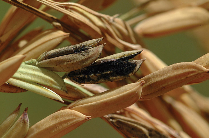 Rain washes the black spores over adjacent parts of the panicle. Affected grains are a lighter, slightly grayish color compared with normal grain. Usually, only a few florets may be affected in a panicle, but fields have been observed in Louisiana with 20% to 40% of the florets affected on 10% or more of the panicles in a field.