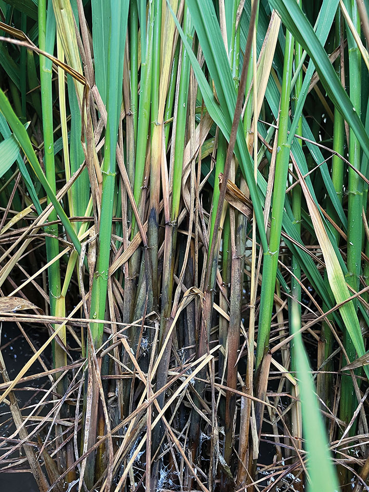 Caused by the fungus Rhizoctonia solani, sheath blight has been an issue in furrow-irrigated rice and that issue has predominantly been at the top end of the field. The mindset of most experts earlier, including myself, was that it would be much less of a problem in furrow-irrigated rice. It’s safe to say we got that one wrong. While there is not a flood to float inoculum into contact with the sheaths, the disease inoculum is still present in the field. Counterintuitive to most earlier reasoning, reports from farmers and consultants and personal observation say that sheath blight is a much more common problem in furrow-irrigated rice than we would have thought, and in fact, the largest issue is at the top of the field.