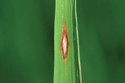 The leaf blast phase occurs between the seedling and late tillering stages. Spots on leaves start as small white, gray, or blue tinged spots that enlarge quickly under moist conditions to either oval or diamond-shaped spots or linear lesions with pointed ends with gray or white centers and narrow brown borders. Leaves and whole plants are often killed under severe conditions. Lesions on resistant plants are small brown specks that do not enlarge. On stem nodes, the host tissue turns black and becomes shriveled and gray as the plant approaches maturity. Culms and leaves become straw-colored above the infected node. Plants lodge or break off at the infected point, or they are connected only by a few vascular strands.