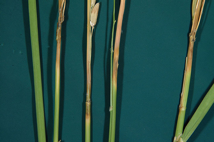 Several practices can help reduce the incidence of all these diseases. Start with making sure you get a good stand, not too thin but also not too thick. Thick stands may result in more tiller diseases because of the high humidity under the canopy. Avoid excess nitrogen; only put a nitrogen topdress if needed. Excess nitrogen favors blast, stem rot, and smut. Also, check potassium levels in your fields. Potassium deficiency can increase the incidence of stem rot and aggregate sheath spot. If you have been baling, this is very important because a lot of potassium is removed with the straw.