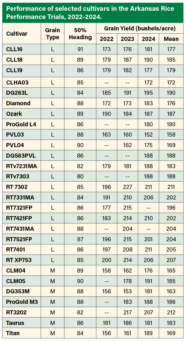 Review the results of the Arkansas Rice Performance Trials at https://uaex.uada.edu/rice. The provided table shows general performance data, but full details of all sites are provided in the complete published data. Let us know if we can help.