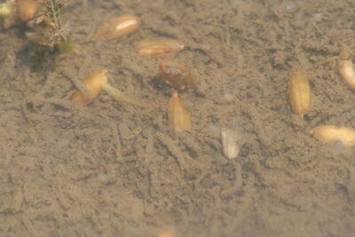 Arthropods have not been very problematic in California the past few years. However, do not let your guard down and let the bugs catch you unprepared. The tadpole shrimp is our key pest. Shrimp tend to be a problem in the same fields year after year because their eggs remain in the soil from one season to the next. Make sure to scout fields soon after seeding, maybe even before seeding, especially fields that take more than a few days to flood. Tadpole shrimp eggs hatch very soon after the field is flooded, and the young shrimp grow quickly. Seeding into a field with shrimp present, even small shrimp, is asking for trouble. Small shrimp (about half an inch or less) can injure rice, just not as much as larger shrimp. Also, do not just rely on the muddiness of the water. When they are small, shrimp do not disturb the soil much; therefore, you might not see muddy water even though shrimp are present.