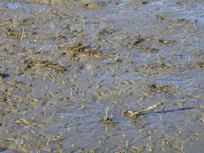 Inadequate stand establishment is a common problem in water-seeded and conservation tillage rice, especially in a pinpoint flood system. The seeding rate when water seeding is 80 pounds to 120 pounds compared to 50 pounds to 80 pounds when drill seeding. Where seed depredation by blackbirds is potentially high, use a higher seeding rate and consider using a bird-repellent seed treatment.