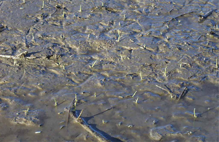 The pinpoint flood system is an excellent means of suppressing weedy rice emerging from seeds in the soil because oxygen necessary for weedy rice germination is not available as long as the field is maintained in a flooded (or saturated) condition. A continuous flood system, another water-seed system, is limited in Louisiana. Although similar to the pinpoint flood system, the field is never drained after seeding.