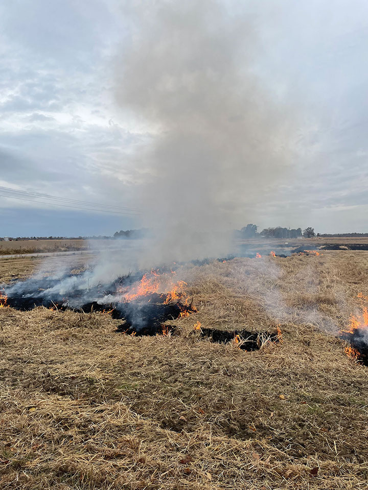 First thing first is the obvious and usually most yield-influencing nutrient, nitrogen (N). We typically recommend increasing N rate by 20 pounds per acre (43 pounds of urea per acre) for flood-irrigated rice following rice. Regardless of whether the field was burnt, we expect to have less N availability following rice compared to soybean. As a conservative estimate, burning rice straw can release well over 120 pounds of N per acre. If rice straw is left in the field, the very high C:N ratio of rice residue causes the tie up of a lot of N in order to break down the residue. Bottom line, less N for the short-term regardless of management practice.