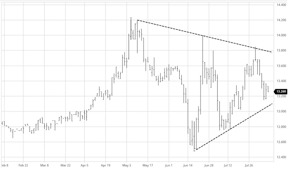 September rice futures now trade very near the 100-day moving average at $13.32 and also in the middle of this summer’s trading range between $14.21 and $12.50. The contract also seems to be consolidating in a wedge pattern, which it is unlikely to break out of before next week’s Aug. 12 World Agricultural Supply and Demand Estimates. This “wedge” provides trendline support near $13.10 and trendline resistance around the $13.78 to $13.80 area.