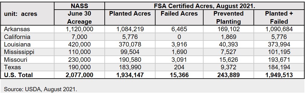 Long-grain certified acreage as of August 2021.