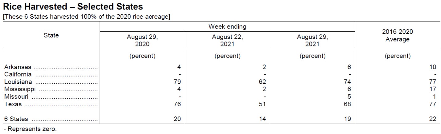 Texas’ harvest was at 68% complete. Mississippi and Missouri were at 6% and 5% harvested, respectively. With Ida’s eastward shift, harvest advanced rapidly this week on warm, dry conditions, particularly in Arkansas and Missouri.