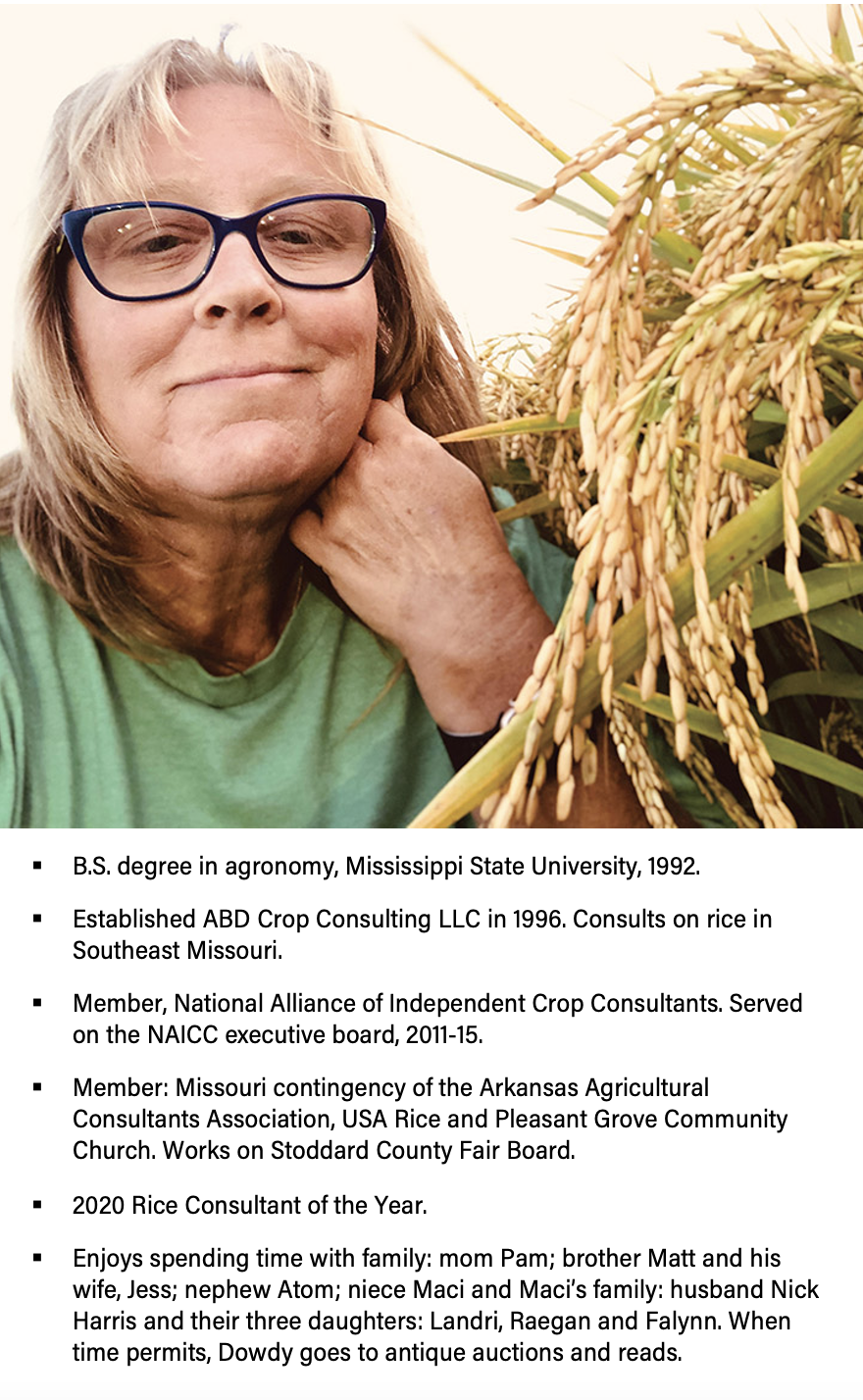 When I was born, I was the only girl in a nursery full of boys. It’s been that way my entire life, but I am comfortable in that environment and blaze my own trail. As a small child, I sat in the front yard and cried to go to the field with Daddy, who called me his little dirt dauber. When he did take me with him, I remember drinking out of the irrigation pipe and playing in the mud. I started “farming” at a very young age. In 1990, I started scouting rice in college and opened my own consulting business in 1996.